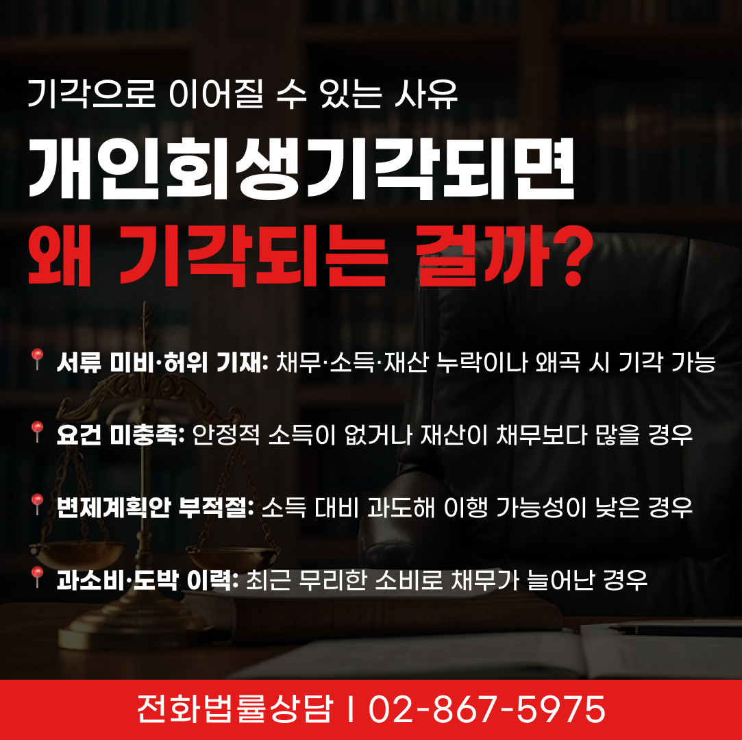 단기간 내 무리한 소비나 도박, 고의적인 채무 증가가 확인될 경우 제도 취지에 맞지 않는다고 판단되어 기각 사유로 작용할 수 있습니다.