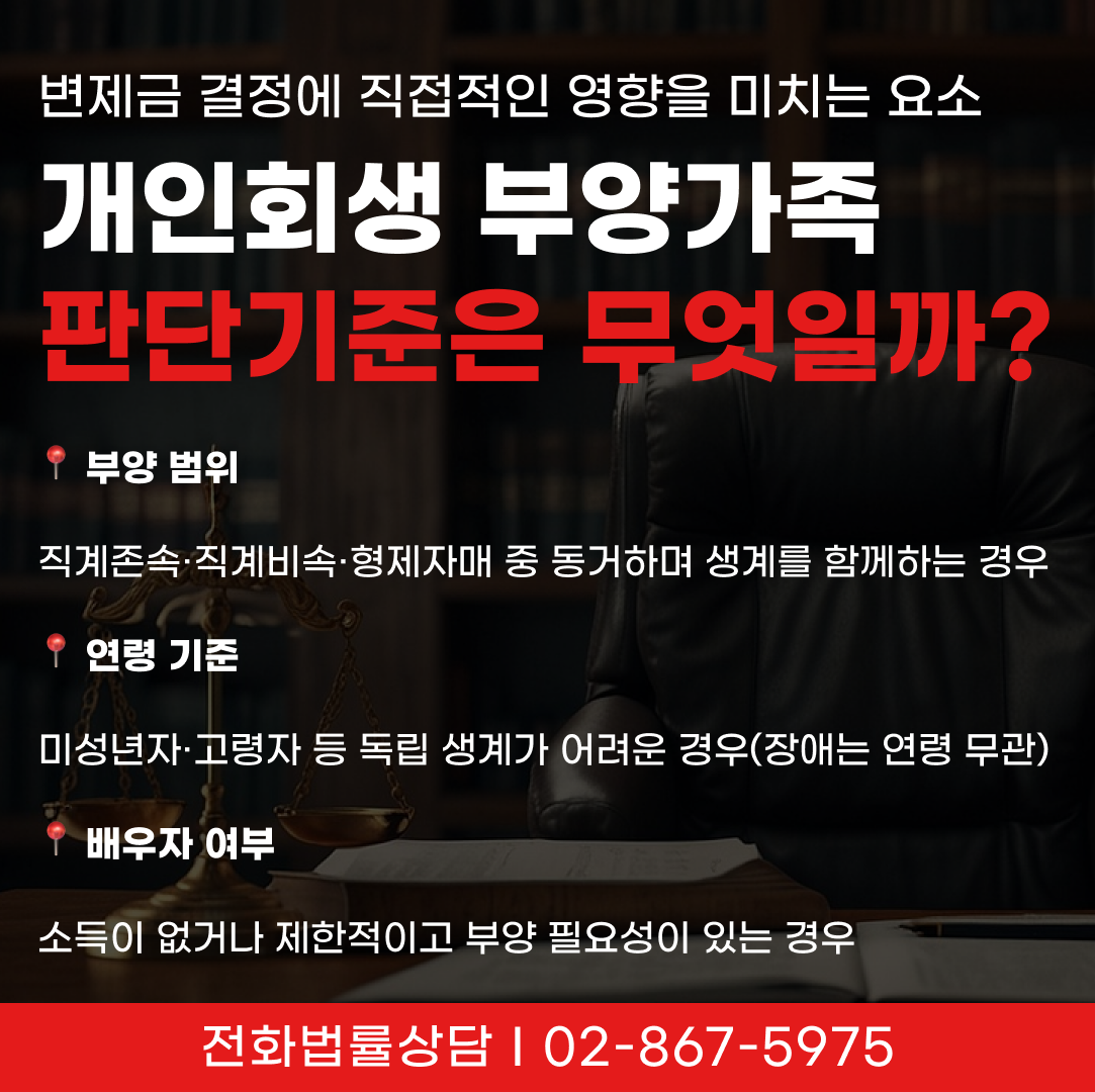 결국 개인회생 부양가족 기준은 형식적인 가족 수가 아니라, 채무자의 실제 생활 여건과 부양 책임을 종합적으로 고려해 판단된다는 점을 유의해야 합니다.