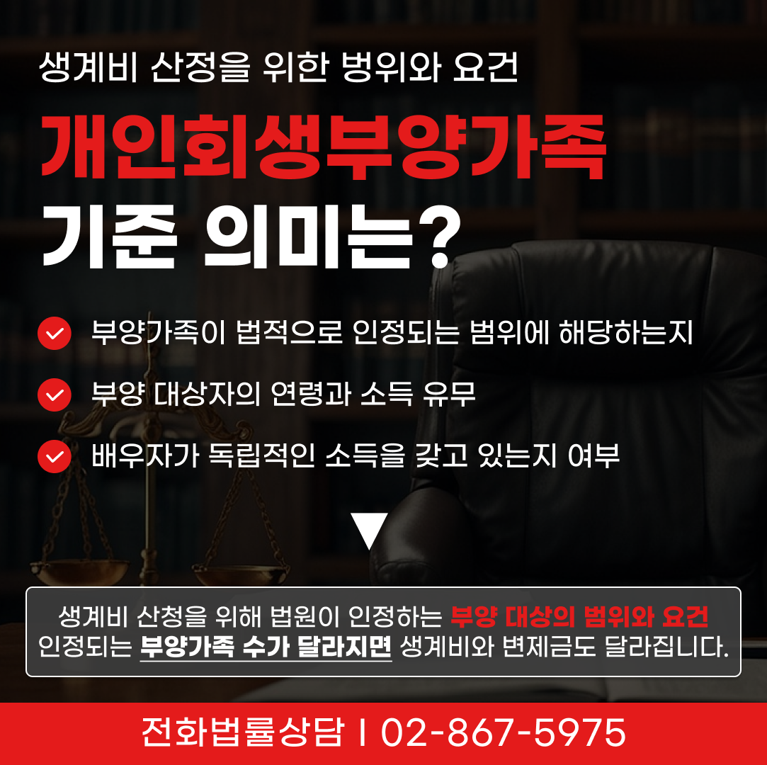 개인회생부양가족기준이란 개인회생절차에서 채무자의 생계비 산정을 위해 법원이 인정하는 부양 대상의 범위와 요건을 의미합니다. 단순히 가족관계에 있다는 이유만으로 자동 인정되는 것이 아니라, 실제로 채무자가 경제적으로 부양하고 있는지 여부를 중심으로 판단됩니다.