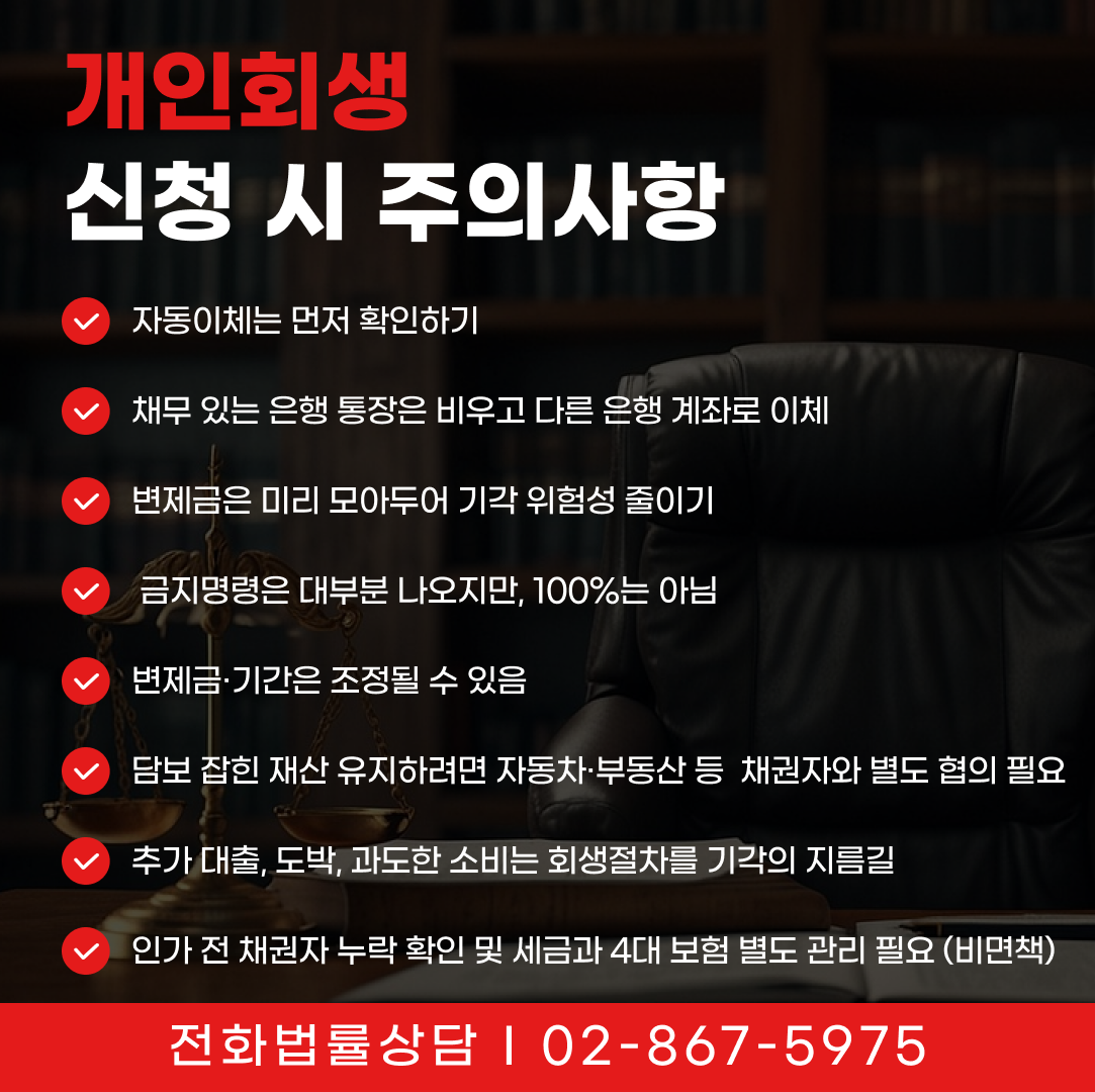 개인회생은 급한 마음에 서둘러 접수하기보다, 절차 특성상 놓치기 쉬운 부분들을 먼저 점검하는 것이 중요합니다. 몇 가지 기본적인 주의사항만 알고 있어도 기각 위험을 줄이고 한층 안정적으로 진행할 수 있습니다
