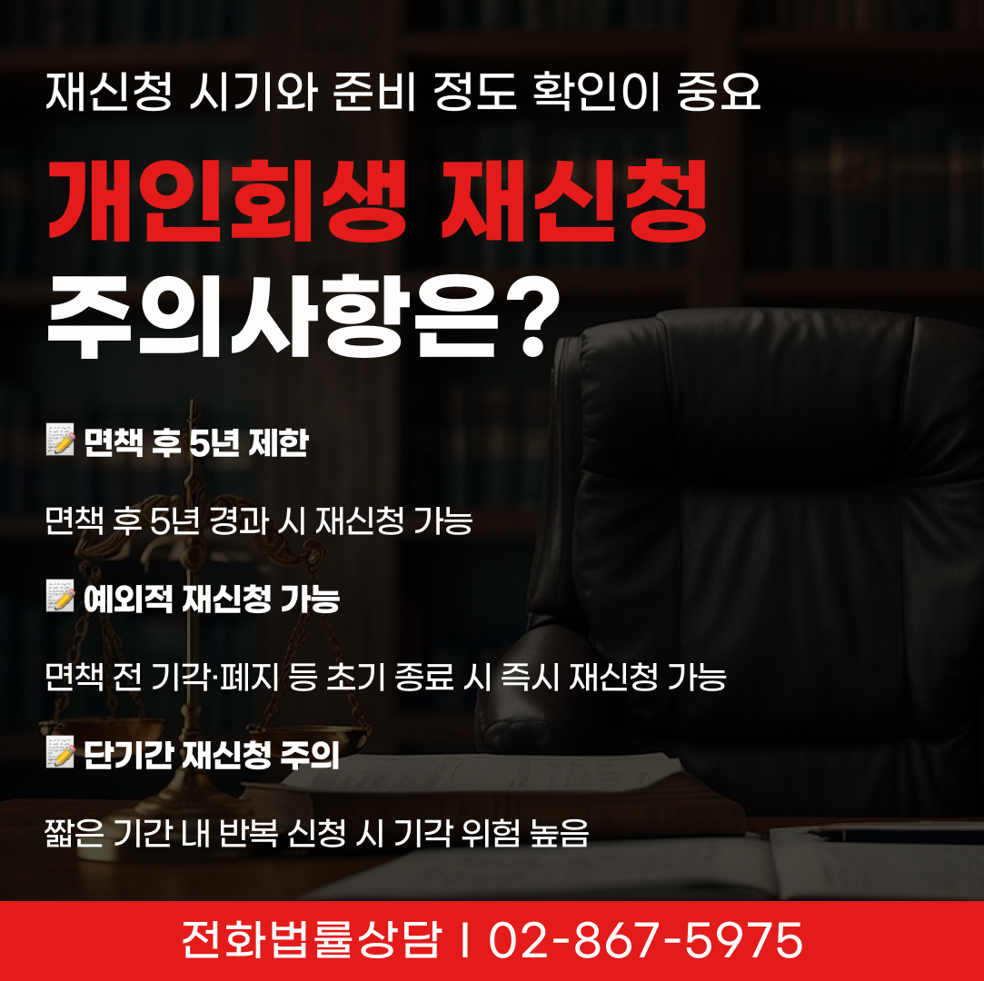 개인회생 재신청을 고려할 때는 단순히 신청 가능 여부뿐 아니라 재신청 시기와 준비 정도를 함께 확인하는 것이 중요합니다. 특히 재신청은 법원의 심사가 더 엄격하게 이루어지기 때문에 사전에 주의해야 할 사항들이 있습니다.