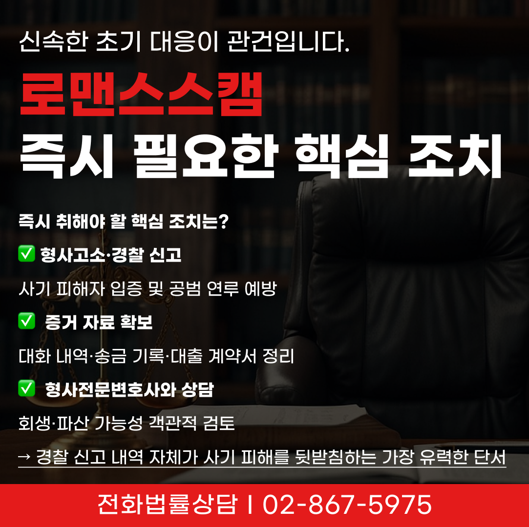 로맨스스캠으로 인해 큰 채무가 발생했다면, 무엇보다 신속한 초기 대응이 중요합니다. 대응 시기를 놓치면 사기 피해자임에도 불구하고 공범으로 오해받을 위험이 커지고, 이후 법적 구제 절차에서도 불리하게 작용할 수 있습니다.