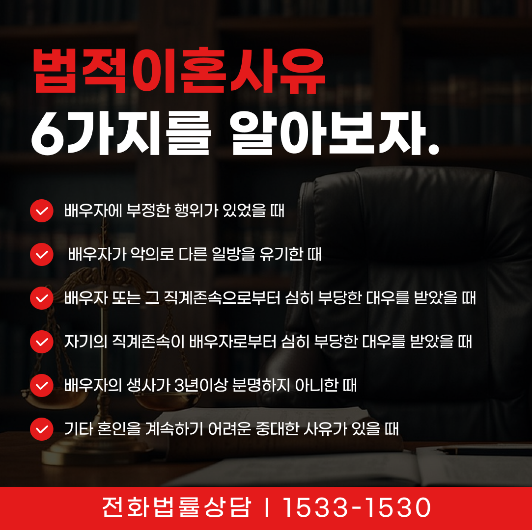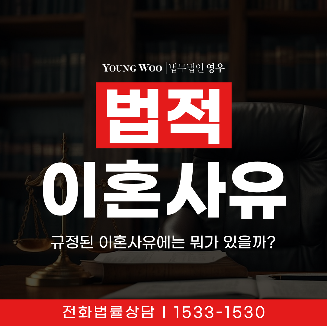 이혼은 단순한 감정의 문제가 아니라 재산분할, 위자료, 양육권, 면접교섭 등 여러 법적 쟁점을 동반합니다. 특히 재판상 이혼은 사유 입증과 절차 진행이 핵심이므로 준비가 부족하면 원하는 결과를 얻기 어렵습니다. 이혼전문변호사는 사실관계 정리, 증거 확보, 전략 수립, 법정 대응까지 체계적으로 지원해 분쟁을 최소화하고 권리를 최대한 보호할 수 있도록 도울 수 있습니다. 법적이혼사유가 궁금하시다면 이혼전문변호사와 상담해 보시길 바랍니다.