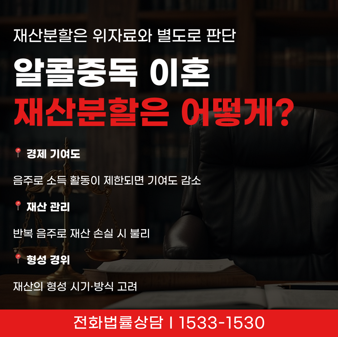 → 이처럼 알코올중독이 직접적으로 재산분할을 좌우하지는 않지만, 구체적인 혼인 경과와 기여도에 따라 결과는 달라질 수 있으므로 위자료 청구와 함께 재산분할을 종합적으로 검토하는 것이 필요합니다.