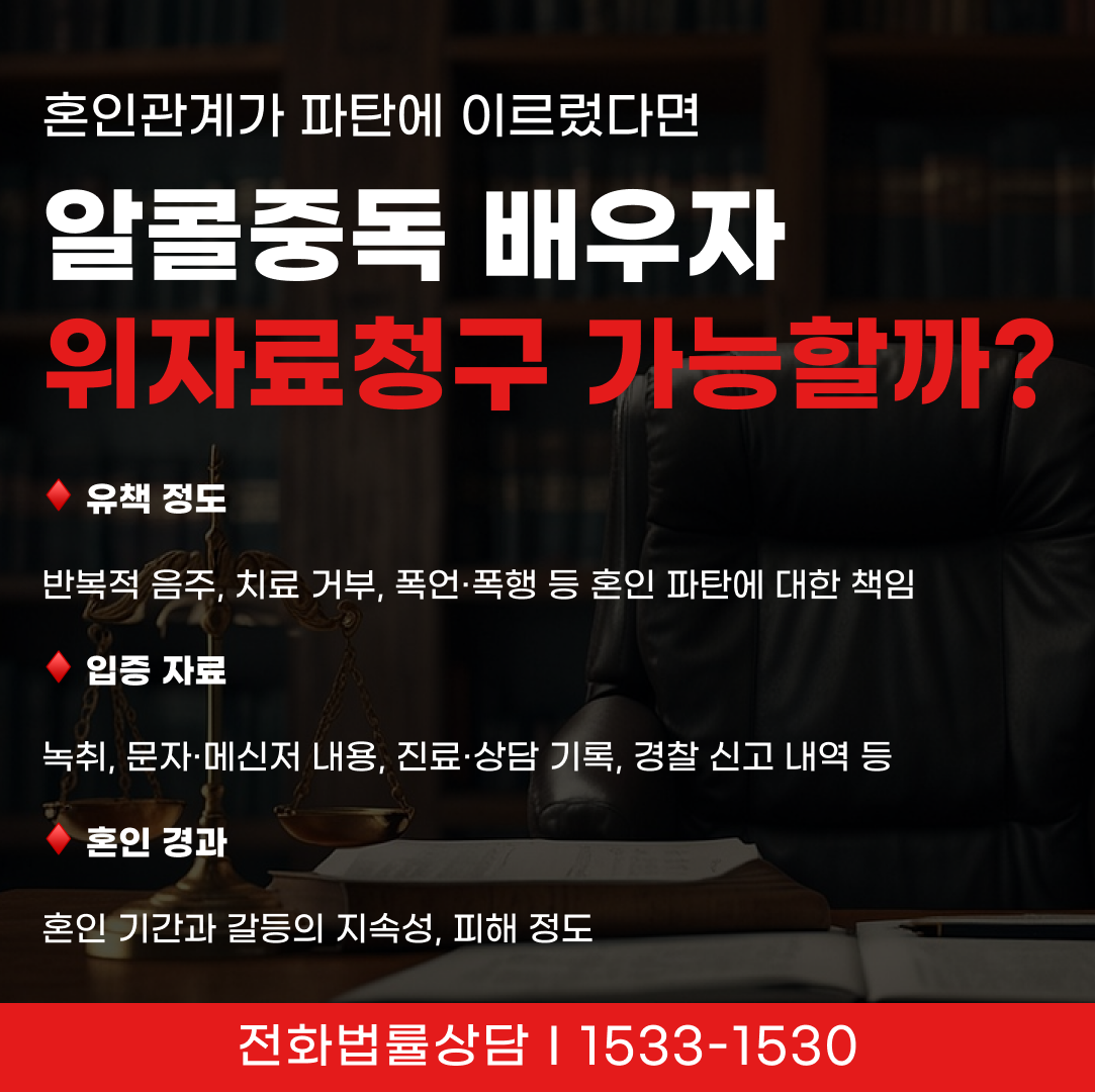 → 이처럼 알코올중독이 혼인 파탄의 주된 원인임을 객관적으로 증명할 수 있다면, 이혼과 함께 위자료 청구를 검토할 수 있습니다.