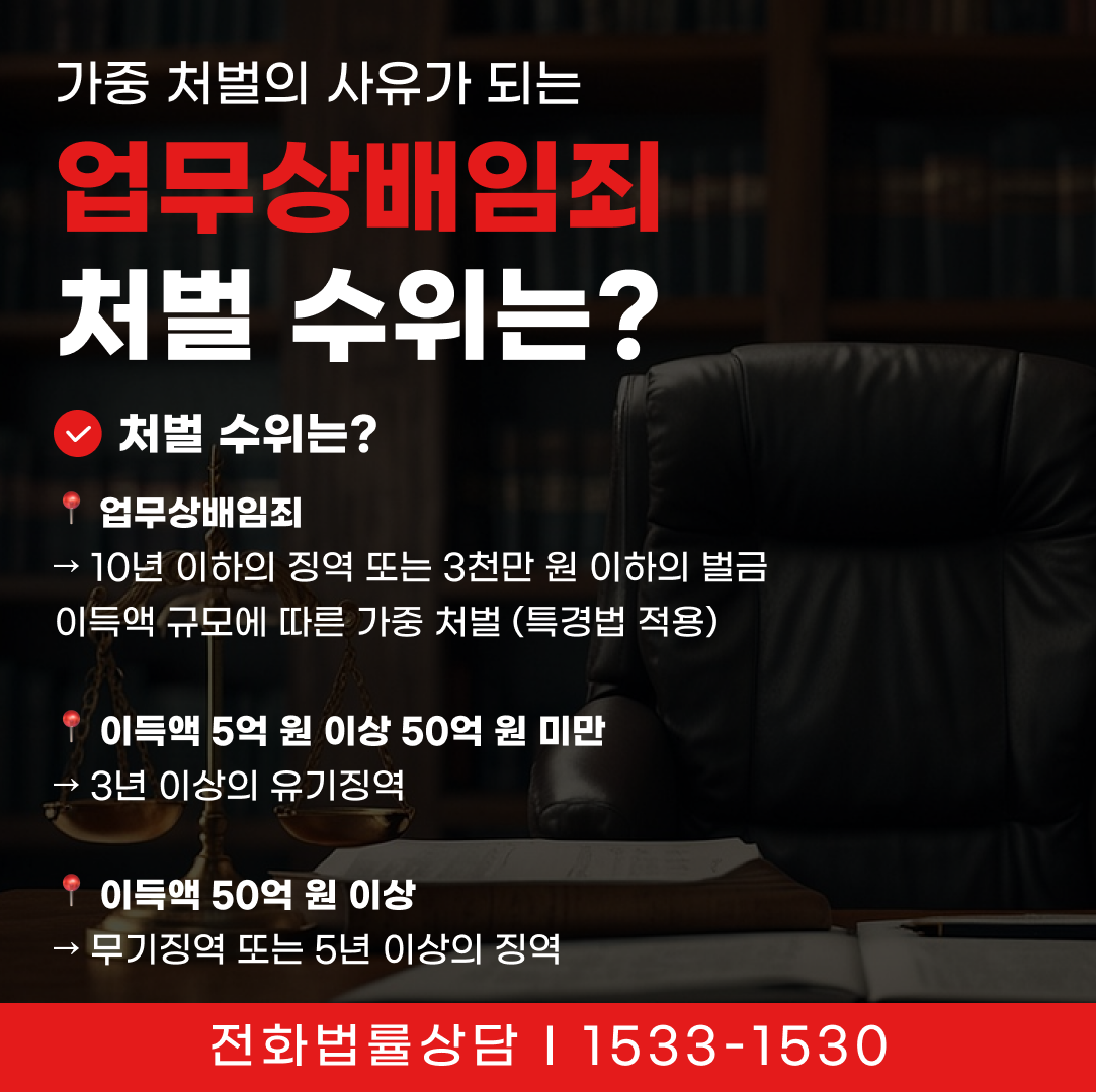 업무상배임죄는 일반 배임보다 책임 지위와 신뢰 침해의 정도가 크다는 점에서 가중 처벌됩니다. 특히 배임으로 취득한 이익 규모가 클수록 처벌 수위가 크게 높아지며, 일정 금액을 초과할 경우 특정경제범죄가중처벌법이 적용됩니다.