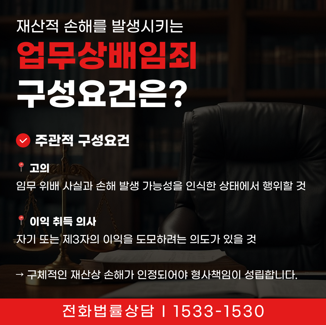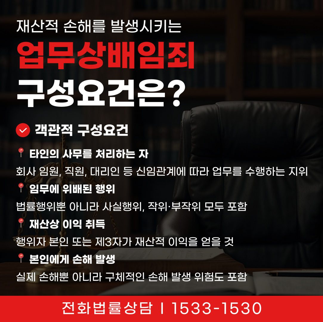 업무상배임죄는 타인의 사무를 처리하는 지위에 있는 사람이 업무상 신뢰를 저버리고 임무에 반하는 행위를 하여 재산적 손해를 발생시키는 경우에 성립합니다. 단순한 판단 착오나 경영상 실패만으로는 부족하며, 객관적 요건과 주관적 요건이 모두 충족되어야 합니다.