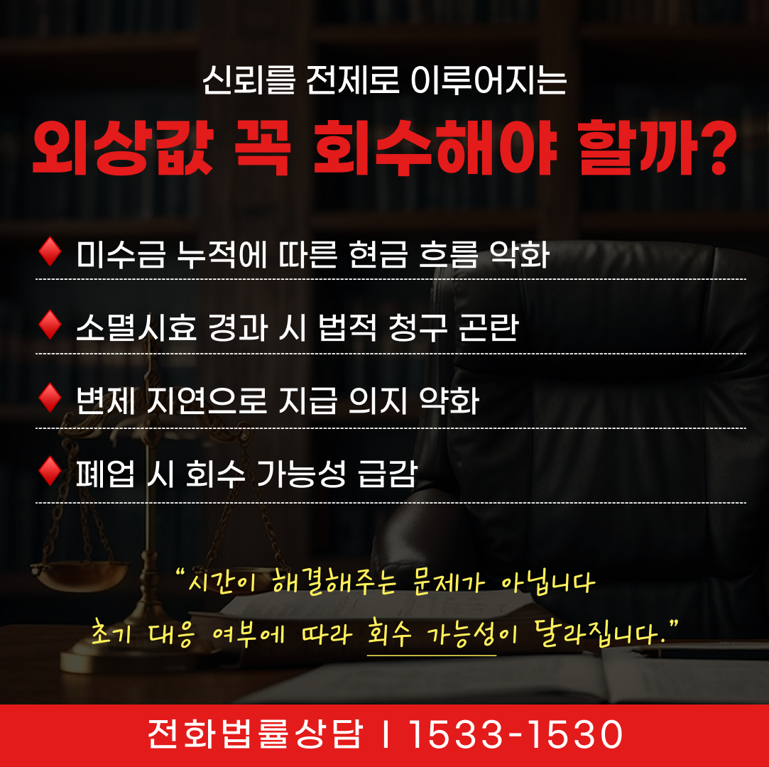 외상값은 시간이 해결해 주는 문제가 아니며, 초기 대응 여부에 따라 회수 가능성이 크게 달라집니다. 거래 초기부터 채권으로 인식하고 체계적으로 관리하는 것이 외상대금 회수의 핵심입니다.