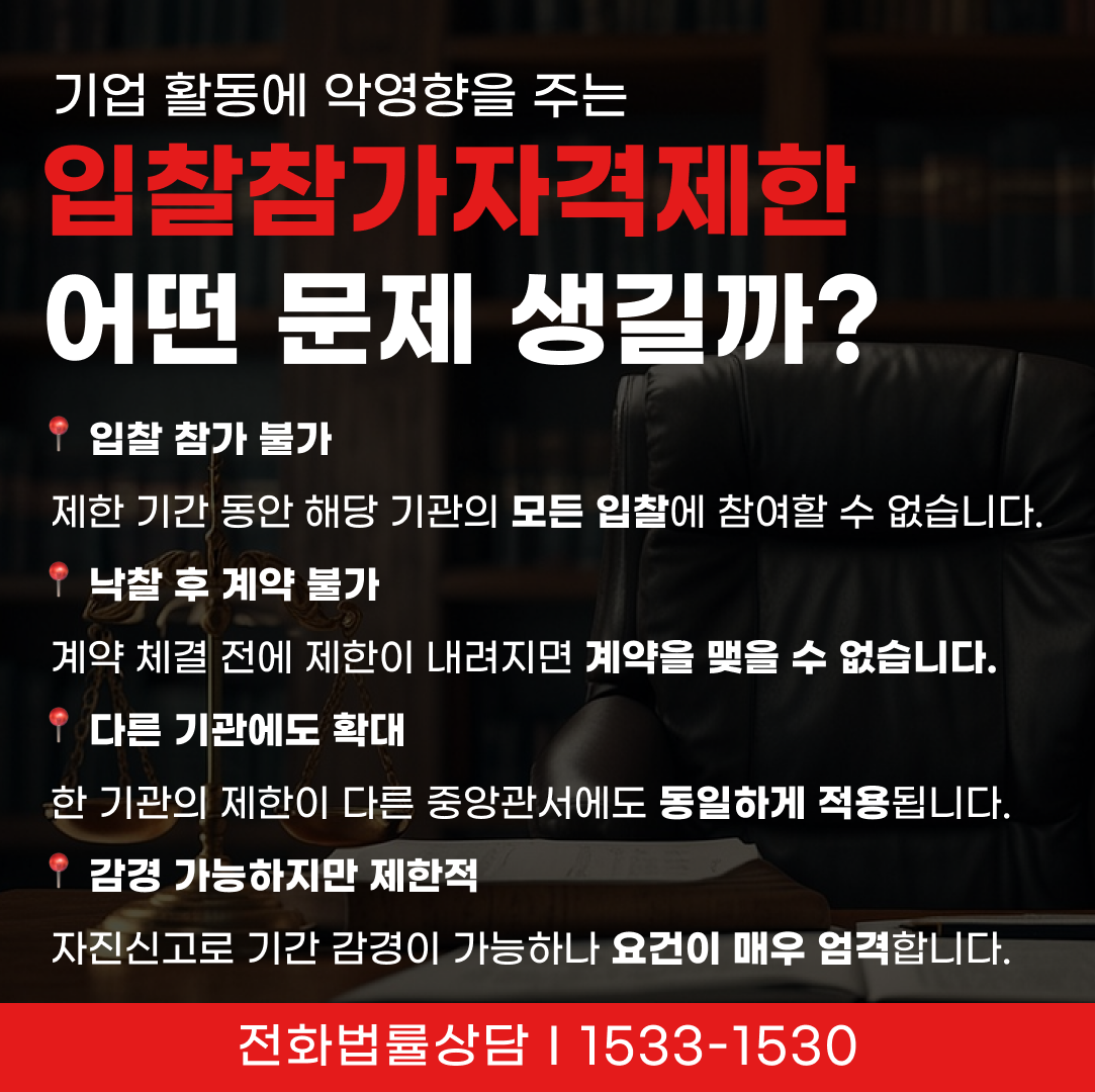 제한 기간 동안 해당 기관의 모든 입찰에 참여할 수 없어, 공공사업 비중이 큰 업체라면 매출에 즉각적인 타격을 받게 됩니다.