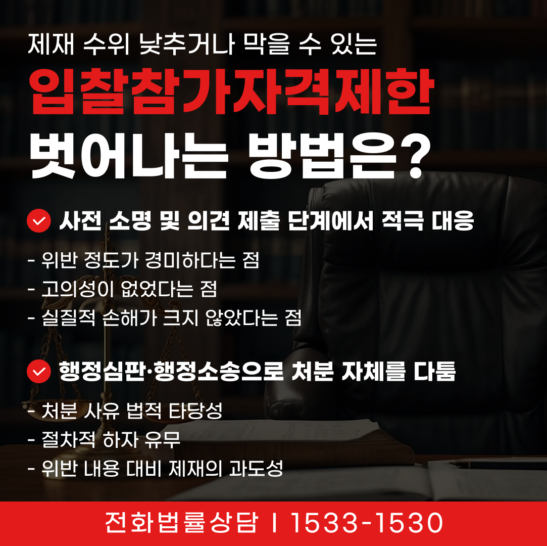 입찰참가자격제한 처분은 기업 활동에 치명적일 수 있기 때문에, 각 단계에서 어떤 주장을 어떻게 펼치는지가 매우 중요합니다. 특히 처분 확정 전에 이루어지는 소명 절차는 제재 수위를 낮추거나 처분 자체를 막을 수 있는 사실상 가장 중요한 기회입니다.