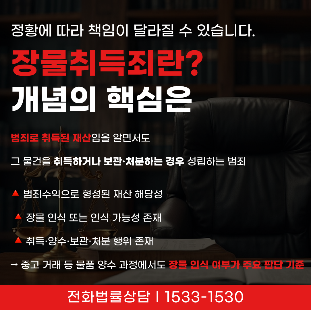 장물취득죄의 핵심은 단순한 소유 여부가 아니라, 범죄로 얻어진 물건이라는 인식과 취득 행위가 있었는지에 있습니다.
