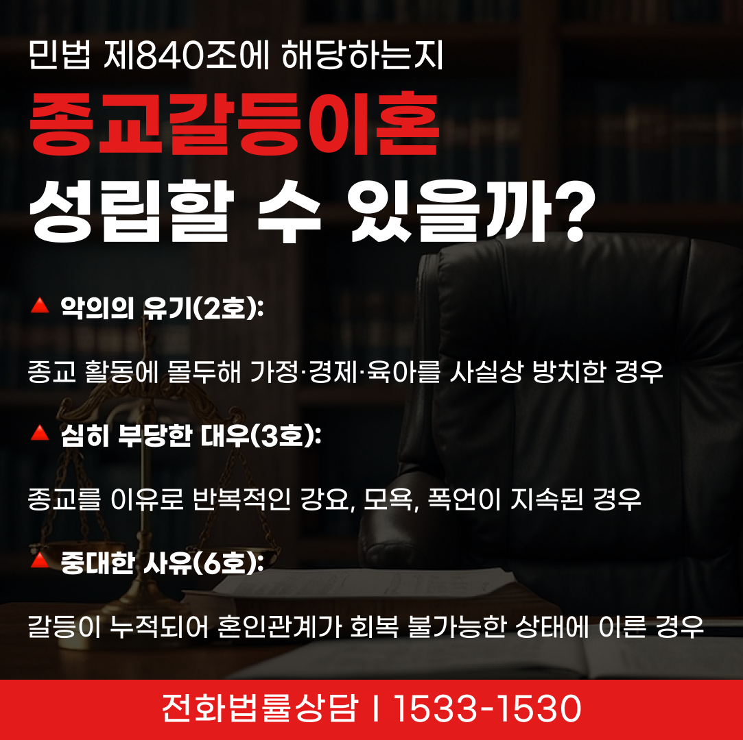 따라서 종교갈등 이혼에서는 감정적 대응보다는 재산 형성 과정과 양육 환경을 객관적으로 정리해 제시하는 것이 중요하며, 이를 위해 변호사의 조력을 받는 것이 불이익을 줄이는 데 도움이 됩니다.