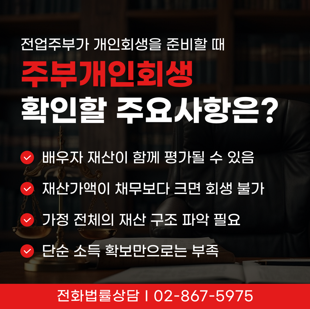 전업주부가 개인회생을 신청하기 전 확인해야 할 주요 사항은 다음과 같습니다.