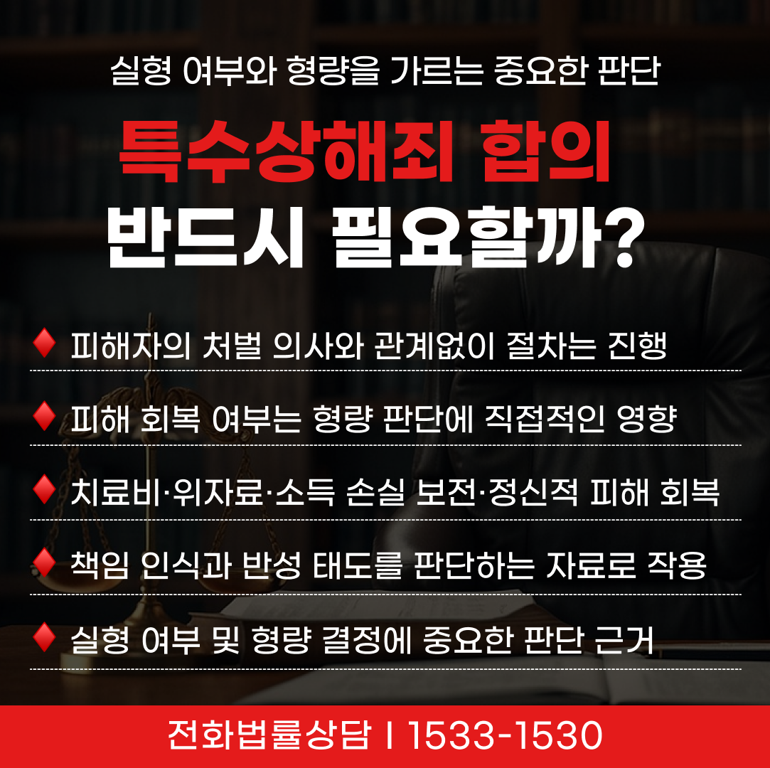 결국 특수상해죄에서 합의는 절차상 필수 요건은 아니지만 실형 여부와 형량을 가르는 중요한 판단 자료가 되므로 사건 초기부터 신중하게 고려해야 할 대응 요소라고 볼 수 있습니다.