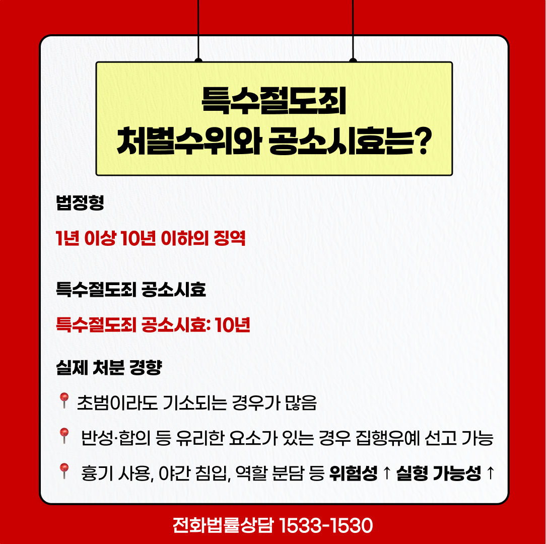 공소시효는 범죄가 발생한 시점부터 일정 기간 안에 국가가 공소를 제기해야 하는 기간을 의미합니다. 이는 일반절도의 공소시효(7년)와 비교하면 더 길게 설정된 것으로 범죄의 위험성과 사회적 침해 정도가 더 크다는 점이 반영된 구조입니다..