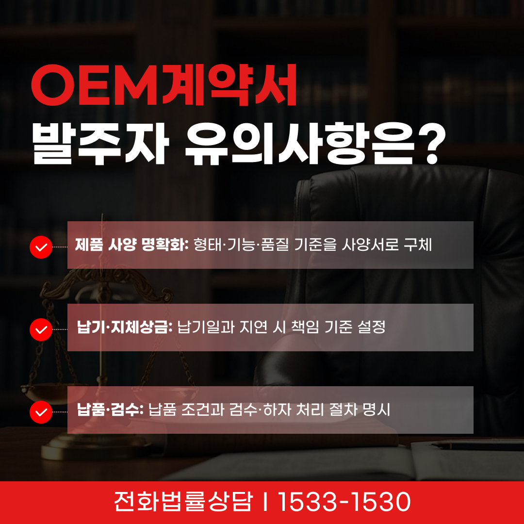 OEM 계약은 생산 결과와 책임이 계약서 내용에 직접적으로 연결되기 때문에, 체결 단계에서의 문구 하나하나가 이후 분쟁의 기준이 됩니다. 특히 발주자와 납품자의 역할이 명확히 구분되는 구조인 만큼, 각 당사자 입장에서 주의해야 할 사항을 구체적으로 정리해 두는 것이 중요합니다.