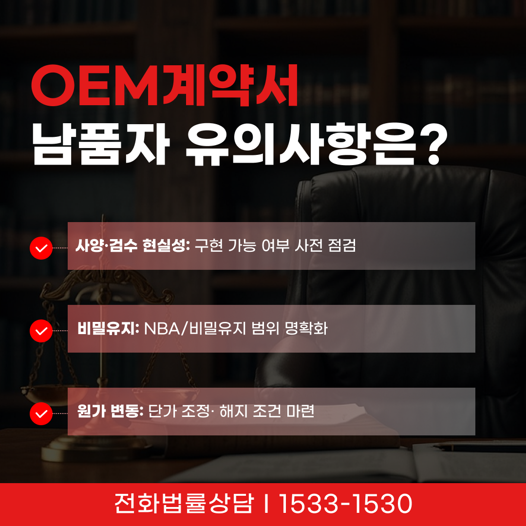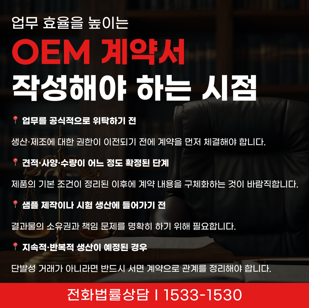→ 이처럼 OEM 계약서는 단순한 거래 문서가 아니라 사업 리스크를 관리하는 핵심 장치이므로, 계약 체결 전 당사자별 입장을 충분히 반영해 신중하게 작성해야 합니다.