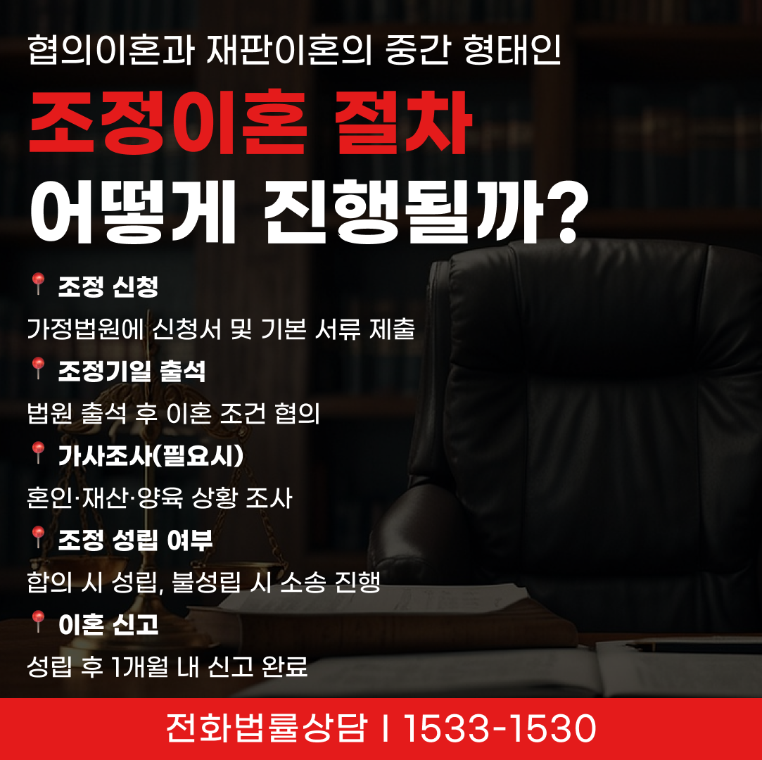 조정이혼은 합의를 전제로 진행되는 절차인 만큼, 재산분할·위자료·양육권 등 주요 쟁점을 미리 정리해 두는 것이 원활한 진행에 도움이 됩니다.