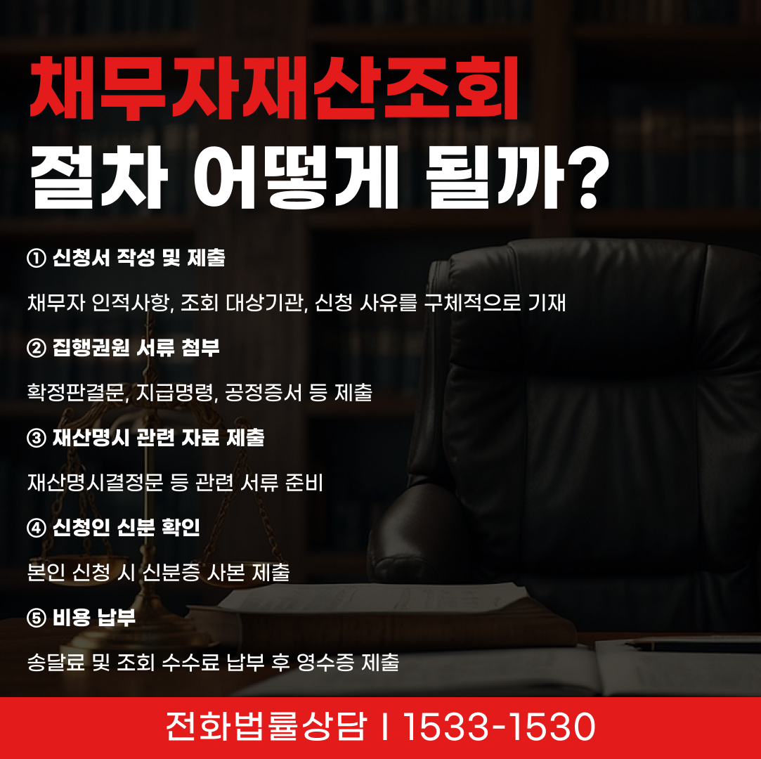 채무를 변제받지 못하는 상황이 지속될 경우, 가장 먼저 확인해야 할 것은 채무자의 실제 재산 여부입니다. 판결이나 지급명령을 받더라도 채무자의 재산이 파악되지 않으면 강제집행이 어려워 실질적인 회수가 이루어지지 않을 수 있기 때문입니다. 이때 활용되는 절차가 바로 채무자 재산조회로, 금융자산이나 부동산 등 재산 현황을 확인해 집행 가능성을 판단하는 데 중요한 역할을 합니다. 다만 재산조회는 신청 요건과 절차가 정해져 있어 이를 정확히 이해하고 진행하는 것이 필요합니다.